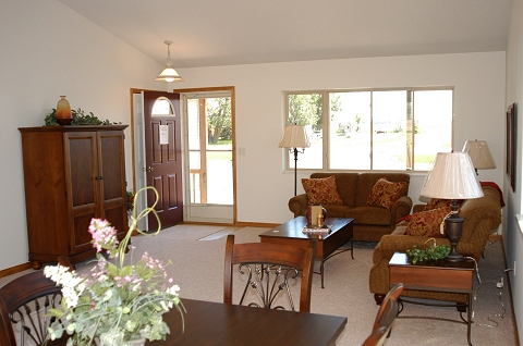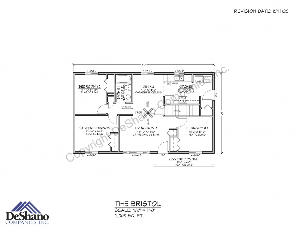 The Bristol surpasses the impossible. With three bedrooms, one bathroom, a liberally-sized kitchen, and an adjoining living room and dining room topped off by a cathedral ceiling, this house still manages to be self-contained, spanning a total of no more than 1,008 square feet.
